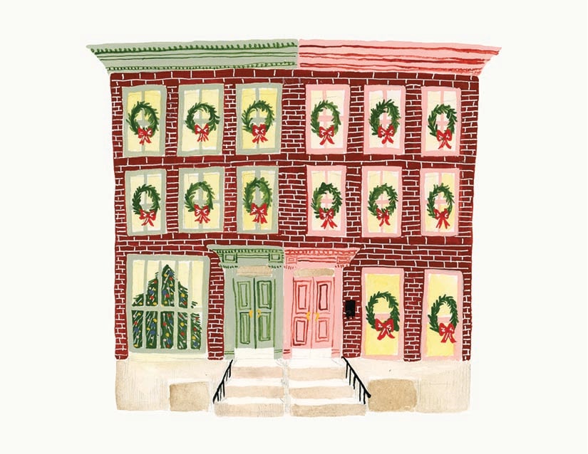 Two horizontal and two vertical Christmas cards featuring original artwork of row houses. Four envelopes are included. Each card is blank inside and printed in the US on recycled paper.